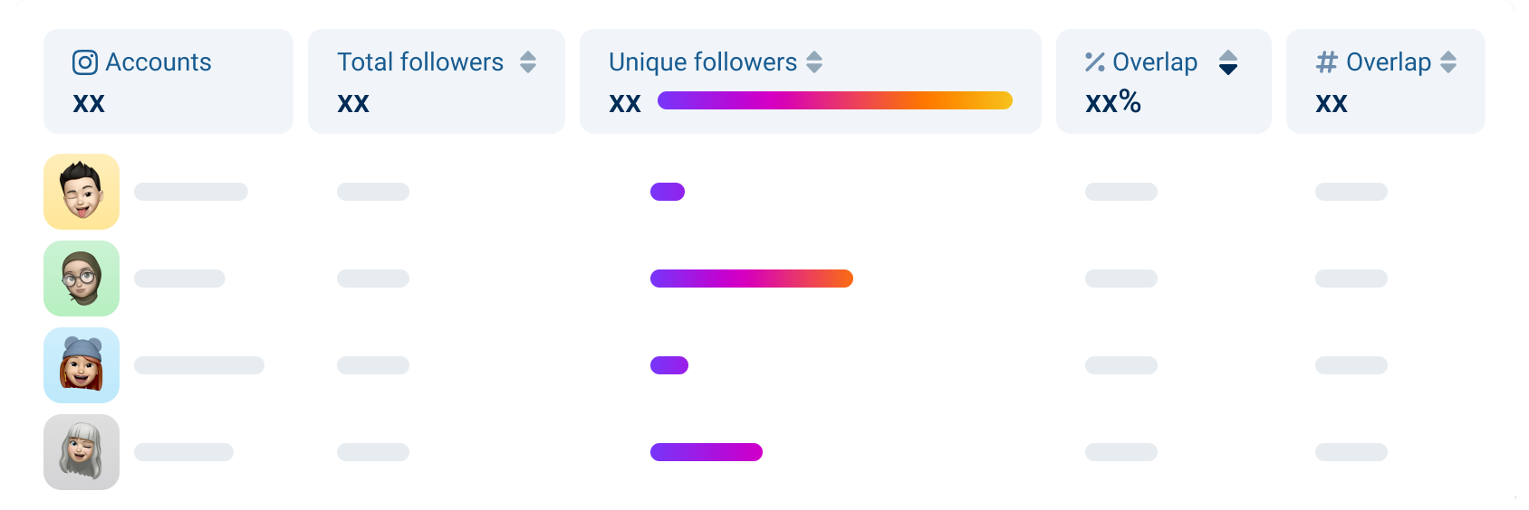 El Audience Overlap proporciona información valiosa sobre cómo se cruzan los seguidores de los KOL seleccionados, permitiéndole identificar seguidores compartidos y únicos, lo que resulta muy útil para optimizar tu estrategia de marketing: